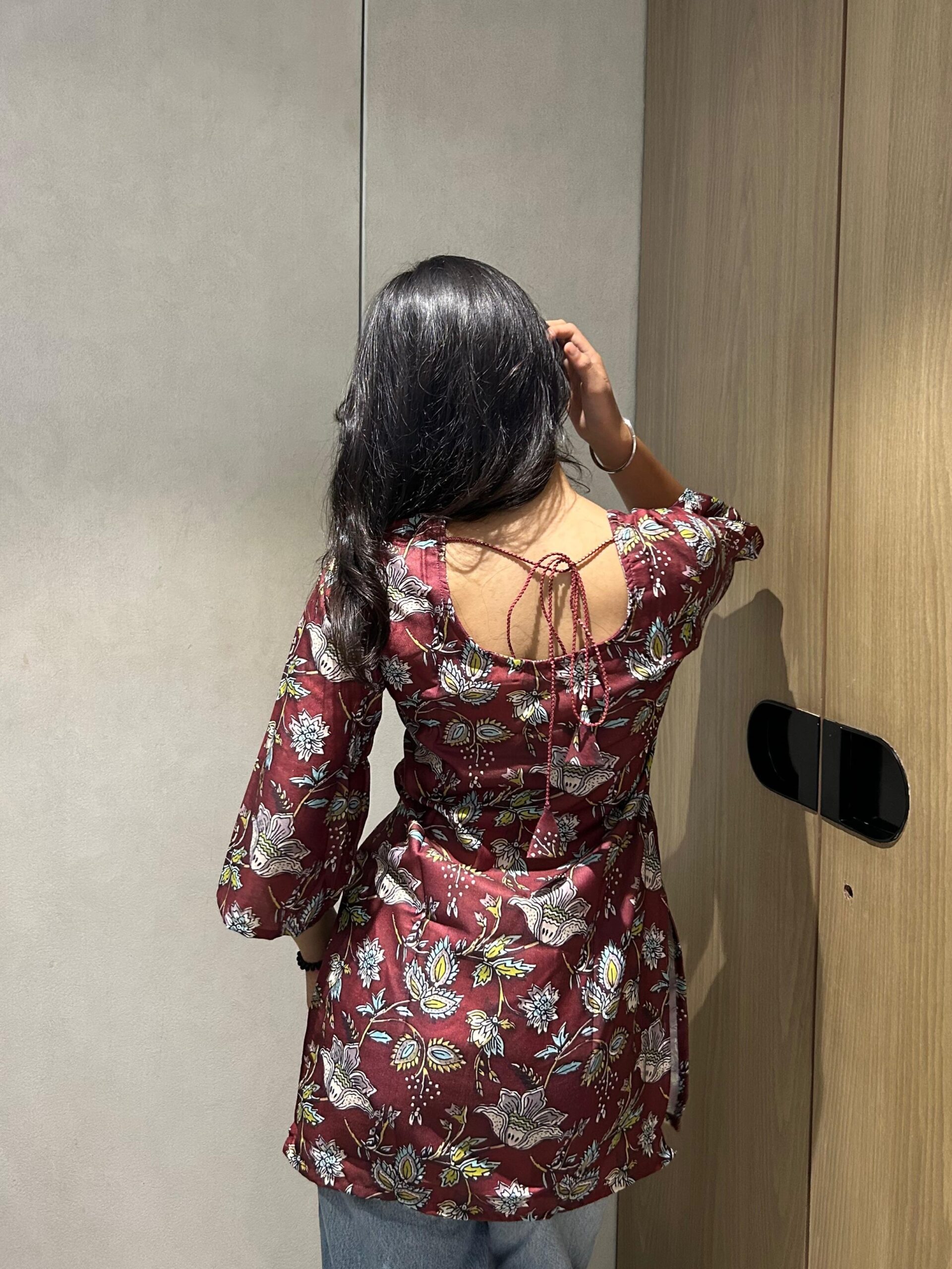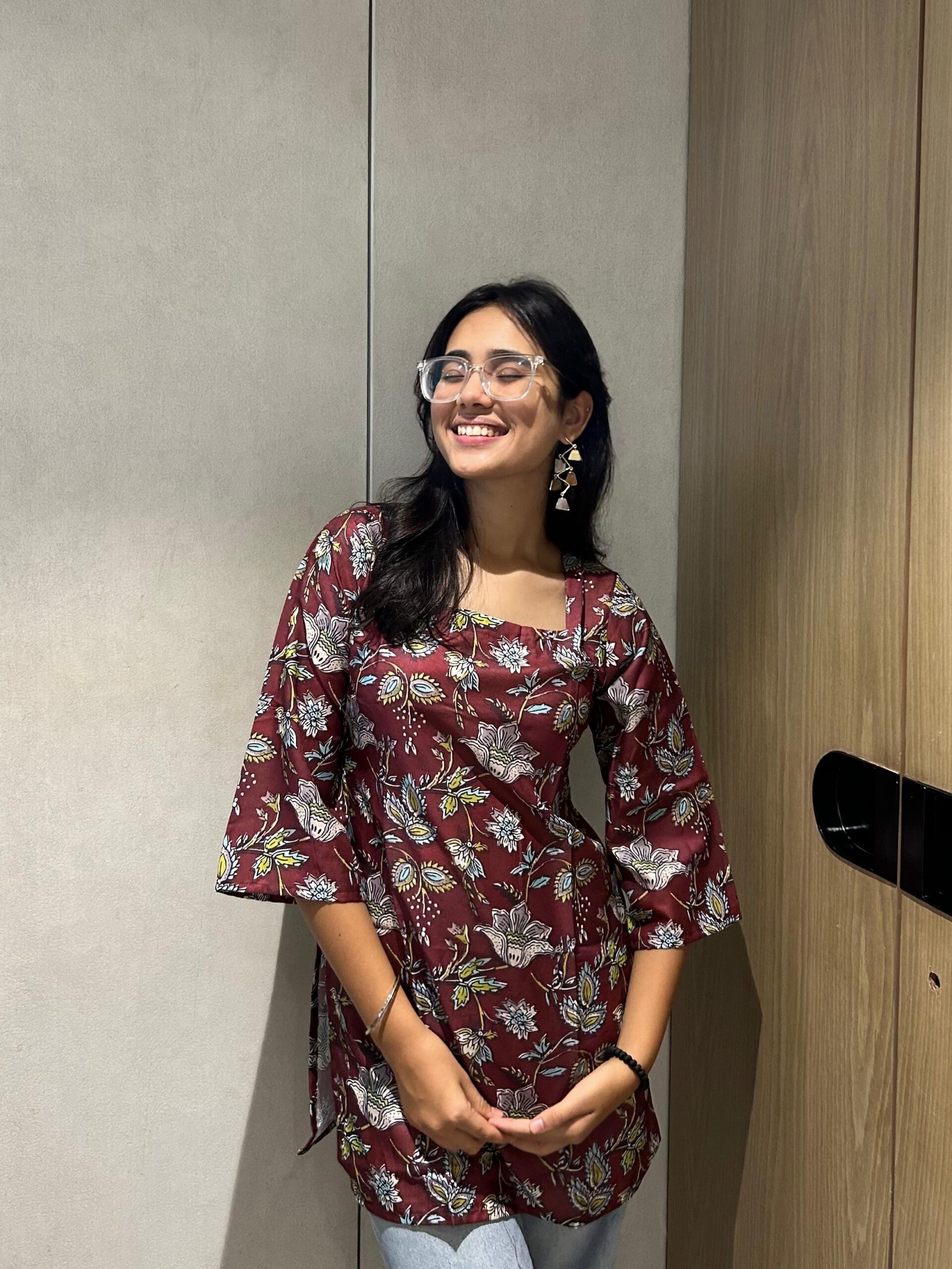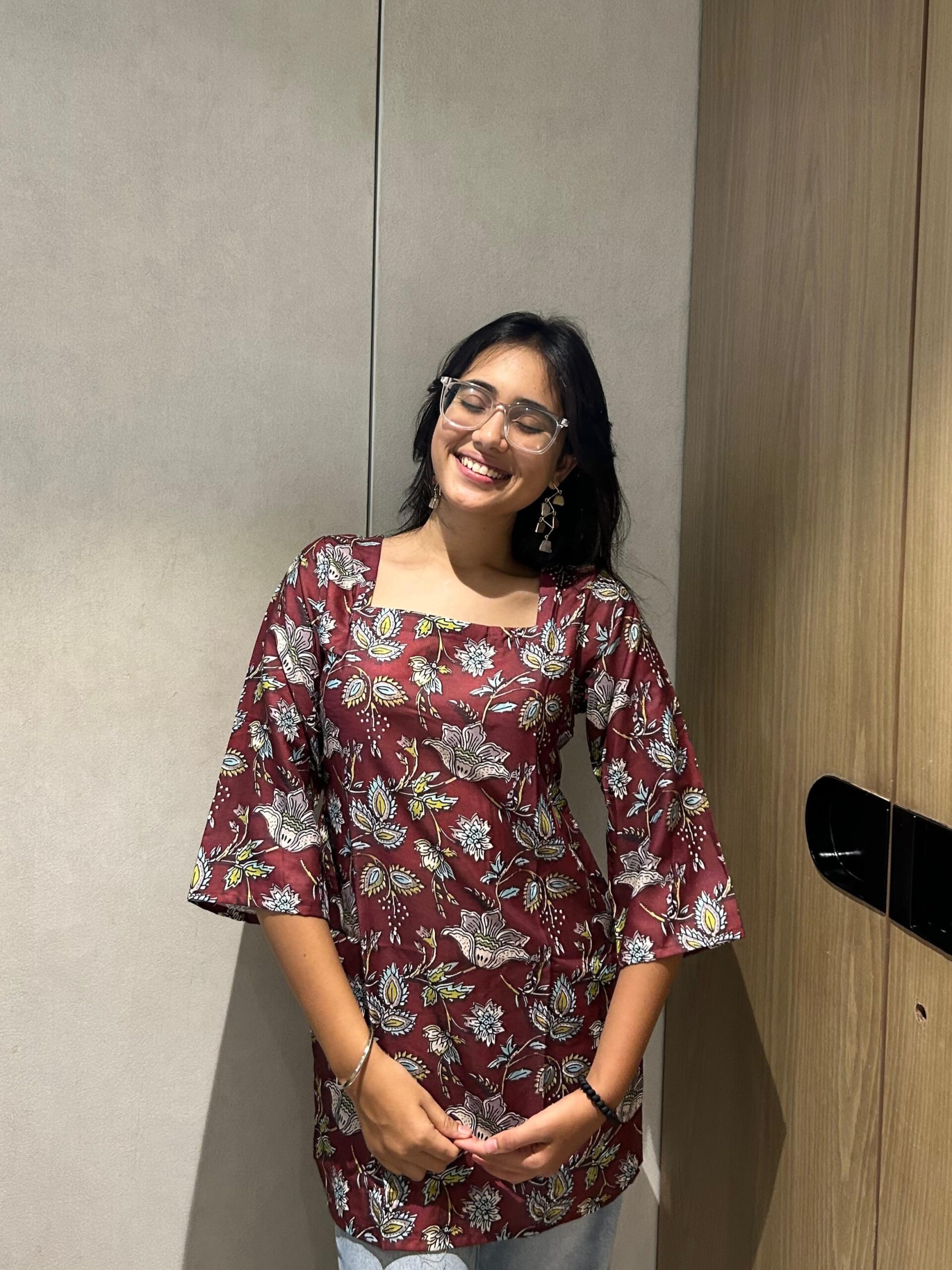 Mini Rose Cotton Kurti, Floral Print, Maroon, Bell Sleeves, Square Neck