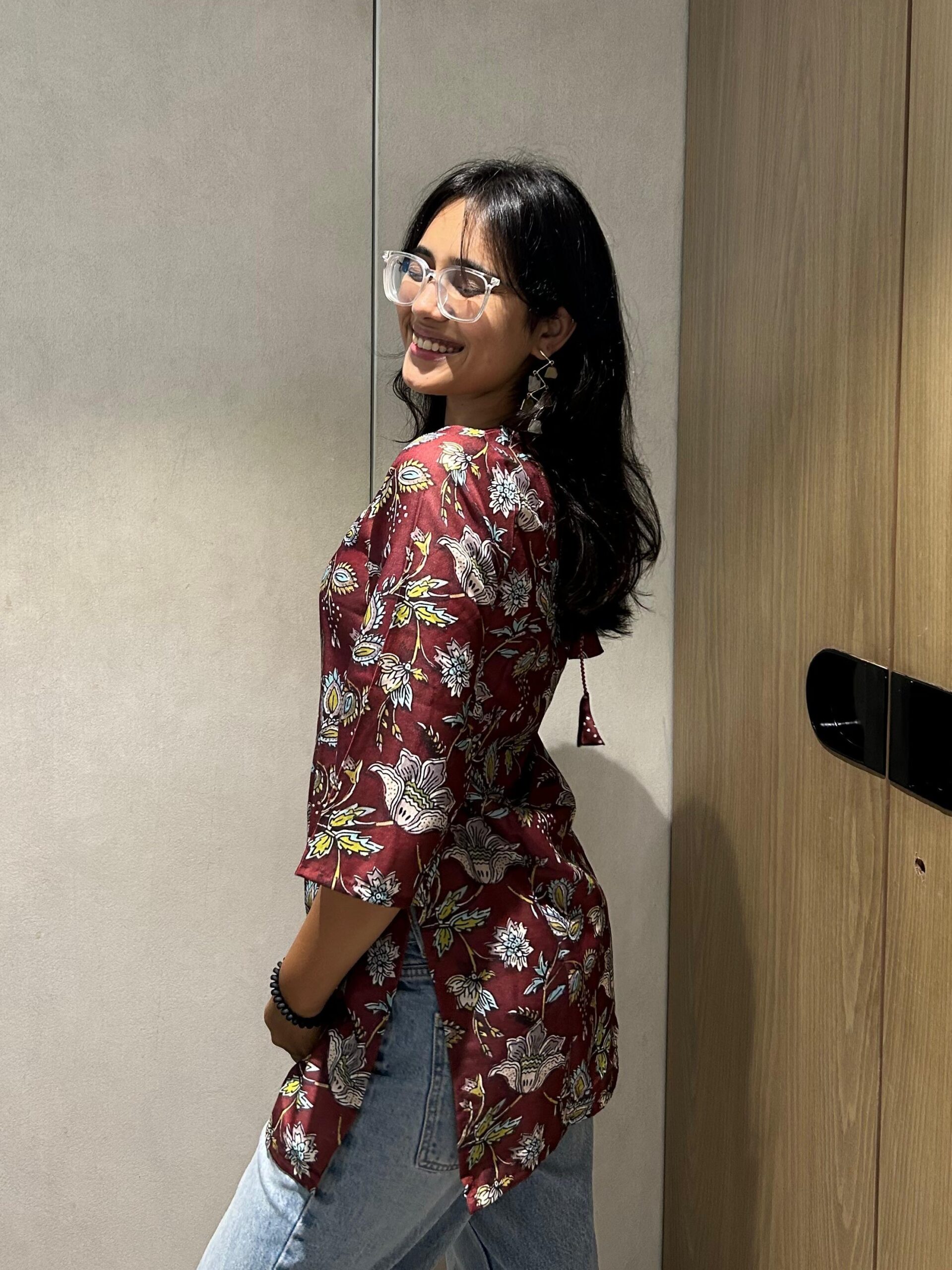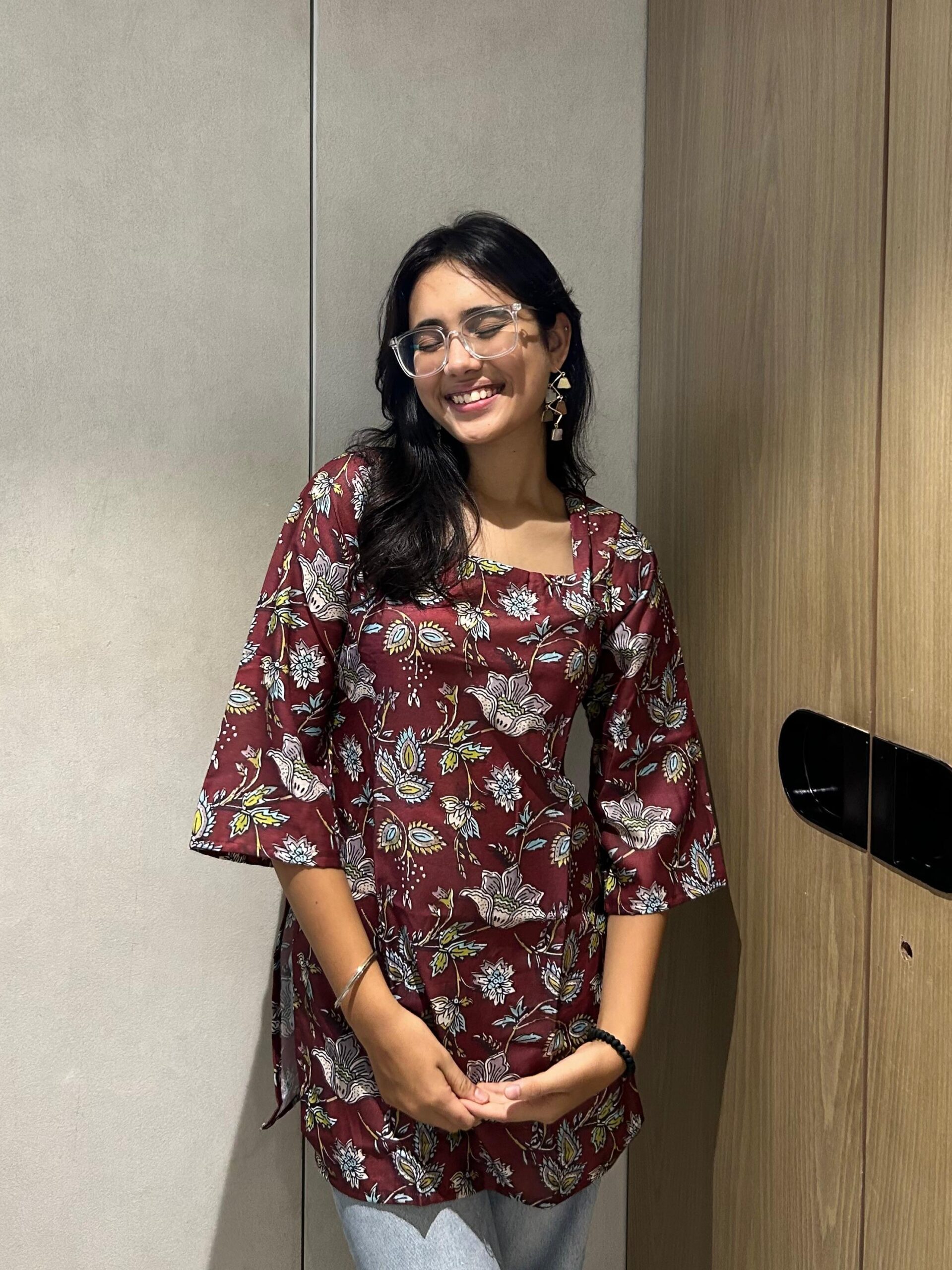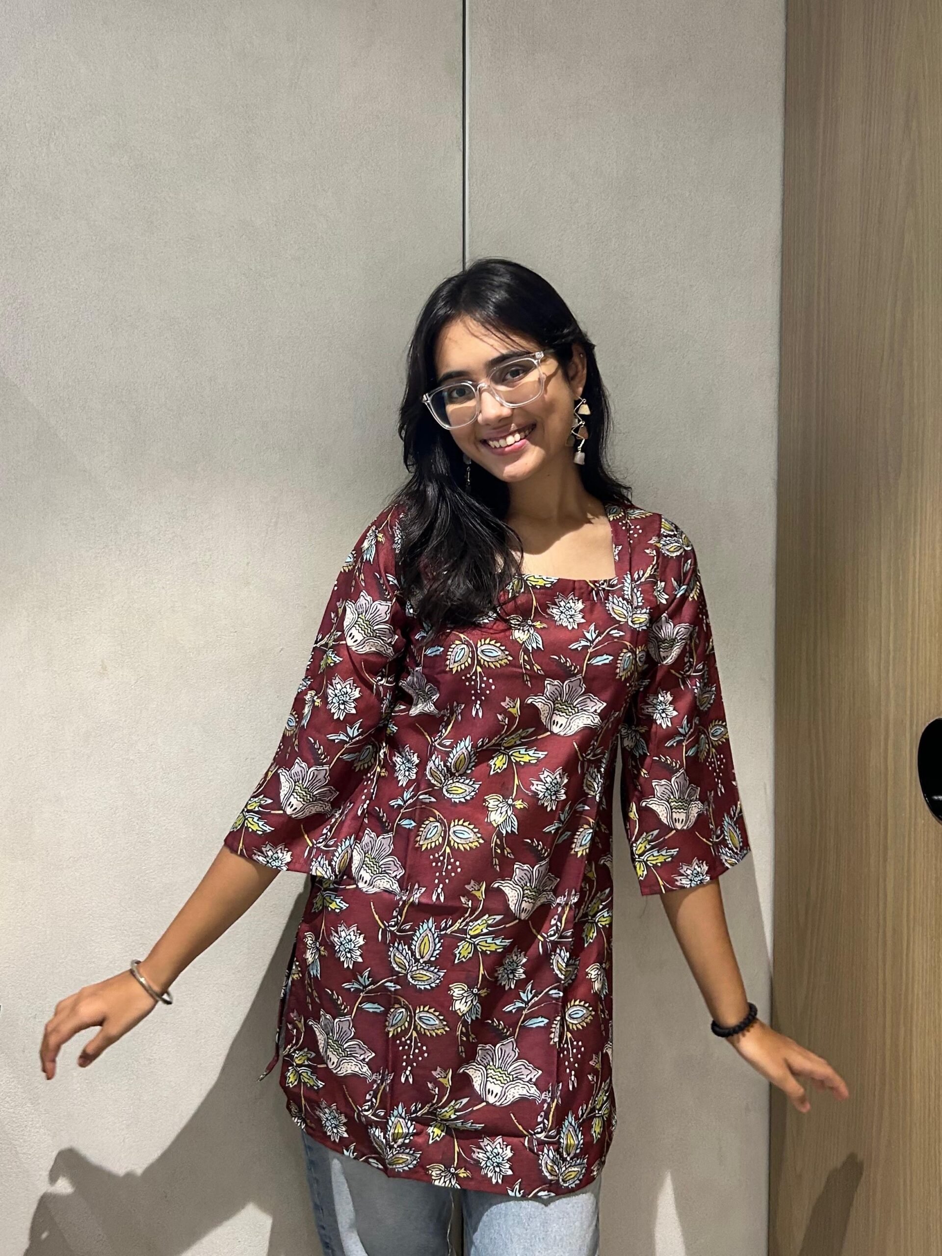 Mini Rose Cotton Kurti, Floral Print, Maroon, Bell Sleeves, Square Neck