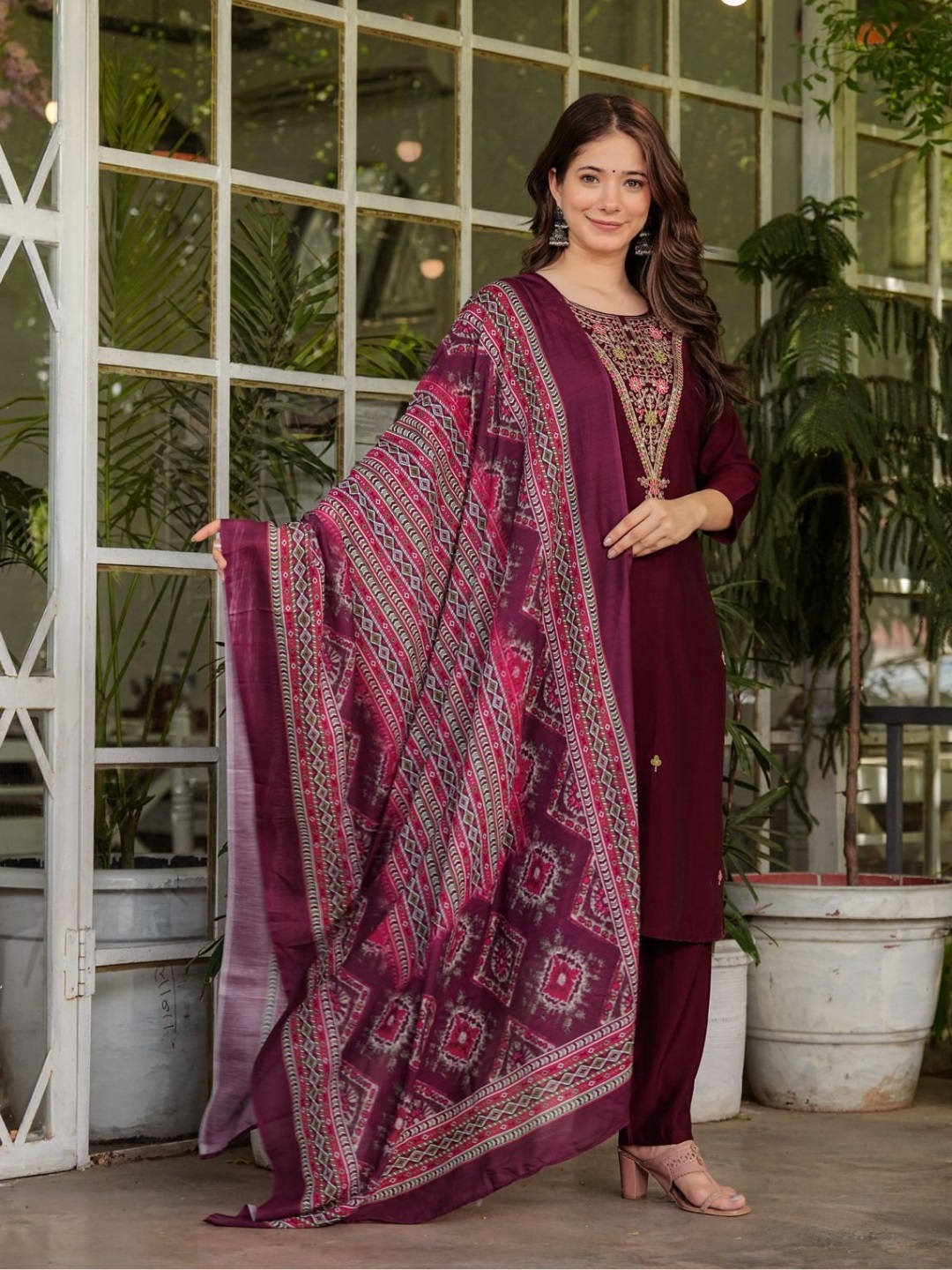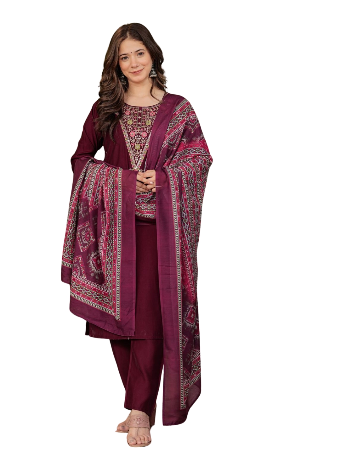 This gorgeous Women’s Round Neck Rayon Slub fabric Embroidery Kurta & Pant with Dupatta Set.